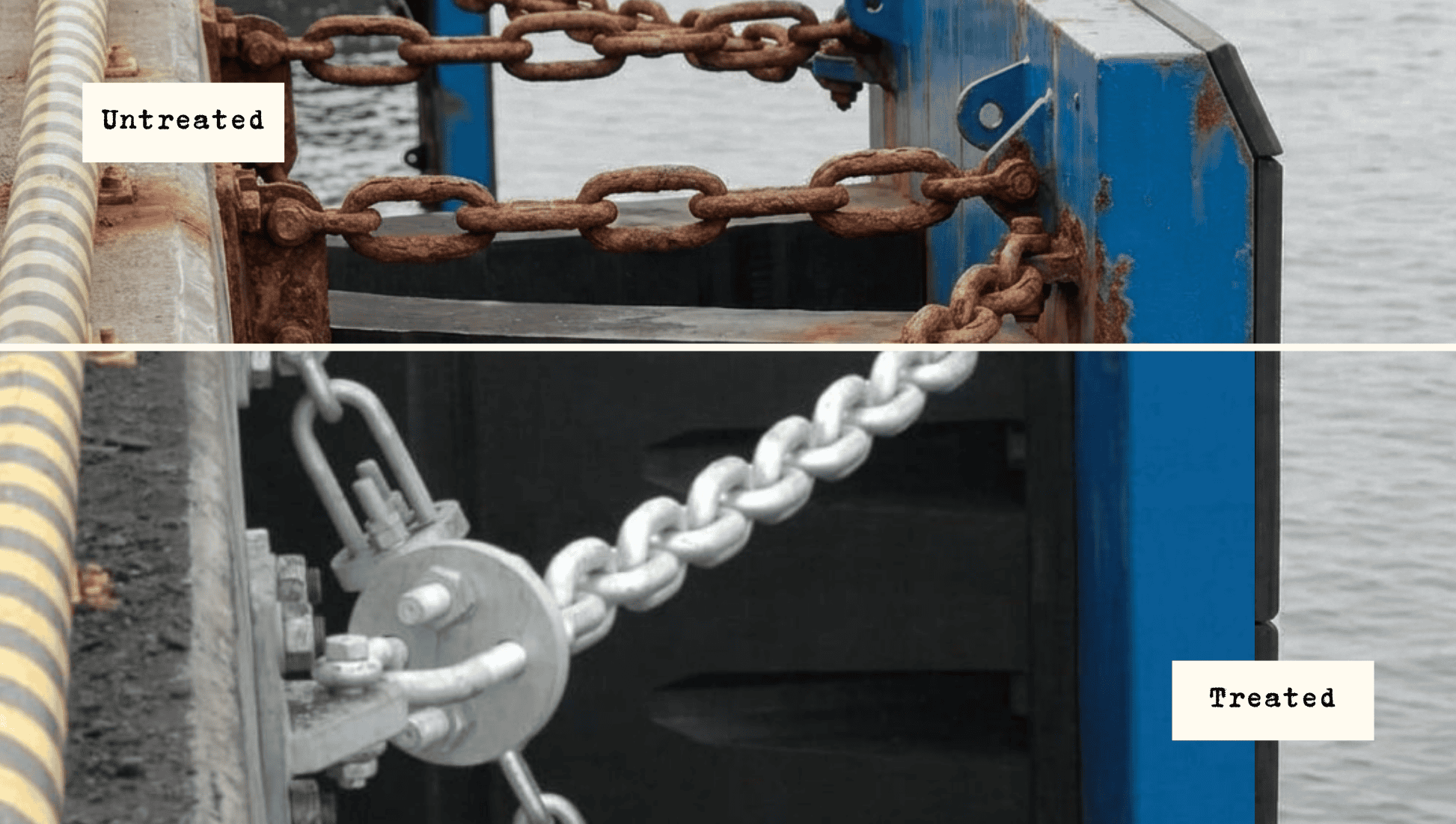 - Protect chains, shackles, rigging hardware, and complex structural connections: The conformal Gentoo reaches links, threads, turnbuckles, and bolted connections—exactly where saltwater accumulates, galvanic corrosion initiates between dissimilar metals, and traditional brush-applied coatings are hardest to apply uniformly without bridging gaps or leaving uncovered crevices.
